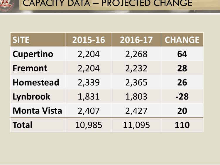 2015年,当学区希望Lynbrook High接受高密溢出生源的时候,他们的报告是这么做的。里面提到Cupertino High的设计容量是1794人,现在已经超员将近500。在不久的将来,学校会超员1000人。而Lynbrook High人口却有小幅下降,所以实际人口低于学校容量。也就是因为这个人口预测,才触发了2015年底的学区重画案。