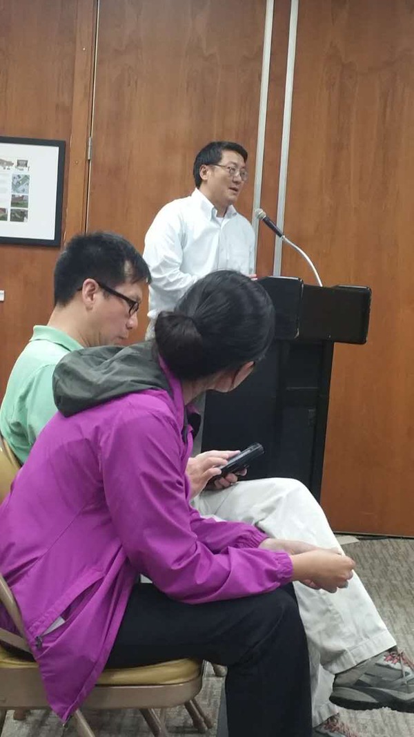 一位委员的讲话。上次会议他严肃指出一些反对者是沛公之意,各自有agenda (elephant)。觉得似乎是支持我们,但同时又问了很多刁钻问题,包括traffic study等等。我猜他是像大法官Kennedy一样的摇摆票。他昨下午给我回信时说不会被威胁,会做出对整个社区利益最好的决定。