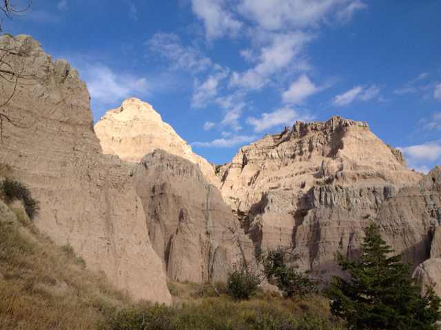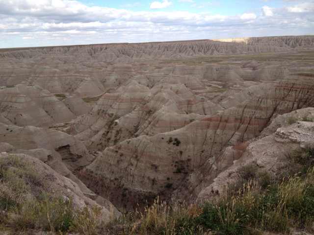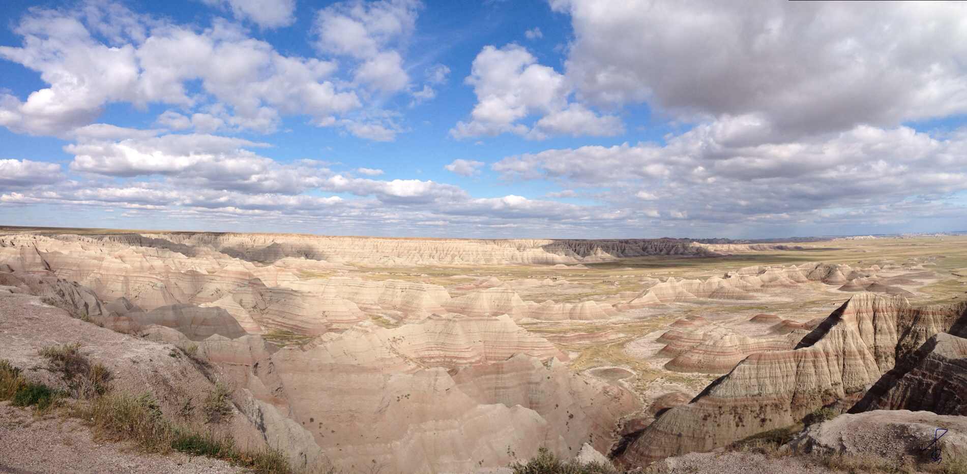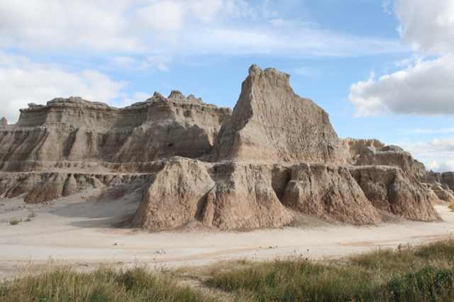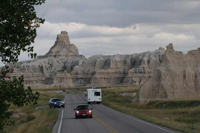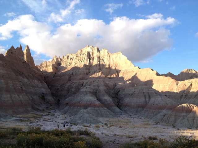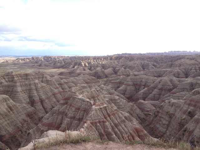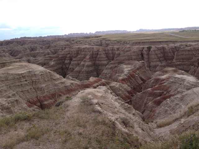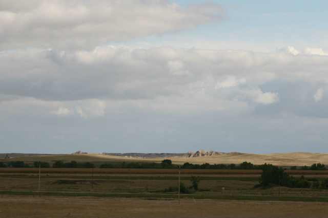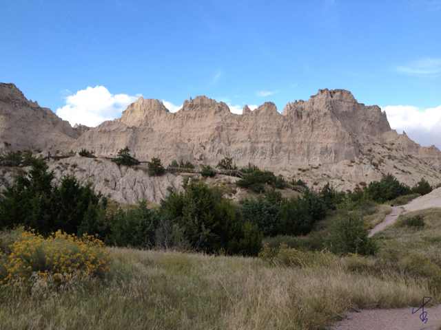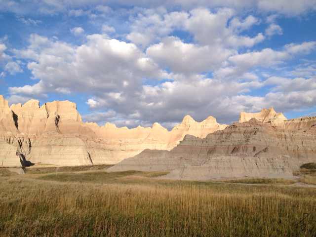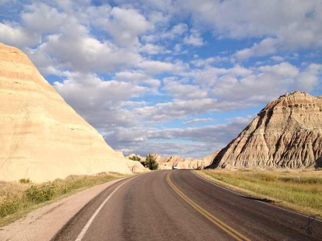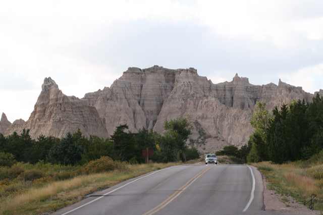 2013年9月15日下午,当我在南达科达草原奔驰,正沉醉于路上那起伏波荡黄绿相间的大平原美景时,突然间,发现了远处貌似有奇迹出现。左边那一片突兀又亮丽的“奇石”究竟是什么?难道是古老的城堡?走得越近,它就越明显,我也愈发兴奋了。