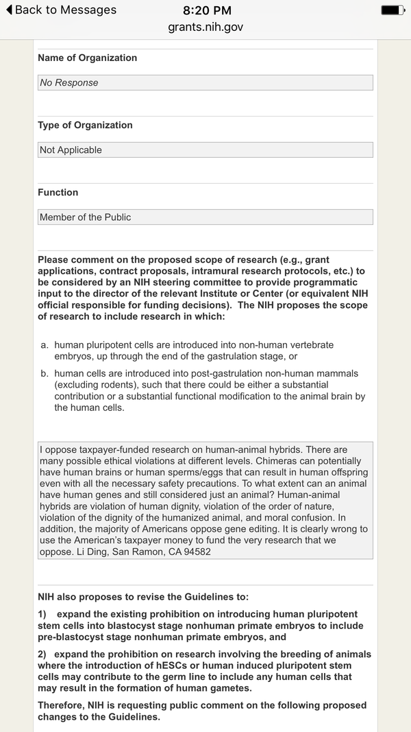 I oppose taxpayer-funded research on human-animal hybrids. There are many possible ethical violations at different levels. Chimeras can potentially have human brains or human sperms/eggs that can result in human offspring even with all the necessary safety precautions. To what extent can an animal have human genes and still considered just an animal? Human-animal hybrids are violation of human dignity, violation of the order of nature, violation of the dignity of the humanized animal, and moral confusion. In addition, the majority of Americans oppose gene editing. It is clearly wrong to use the American’s taxpayer money to fund the very research that we oppose.