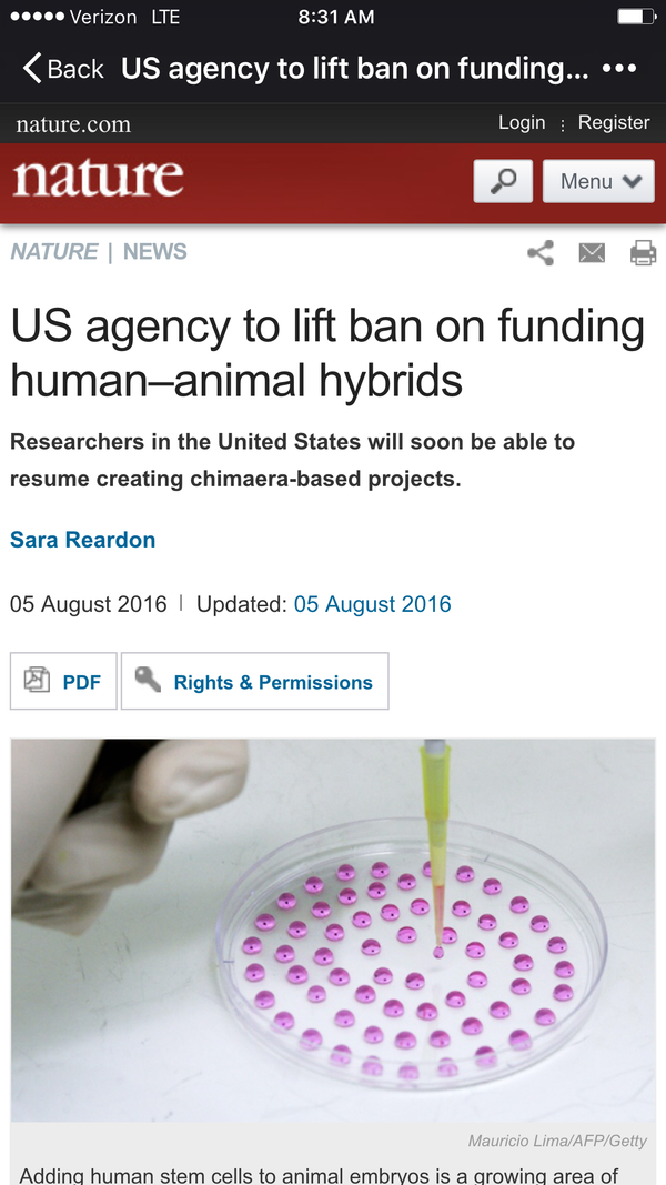 我希望这个是假消息,可是是由Sarah Kim, 这个和牧师丈夫一起来声援我们阻击亚裔细分法的师母和主内姐妹发过来的,仔细一看还真的不是假消息,再询问一下我在FDA的学霸同学医药专家。 好家伙要搞人和动物的混合体了,用大猩猩和人的基因混合,希望能够用来收获人体器官。我的老天!混淆概念的结果是什么?人和牲畜一样?如果混血儿和人一样有思想有感情,我们把他像牲口一样杀了? 何时是人?何时是畜生?