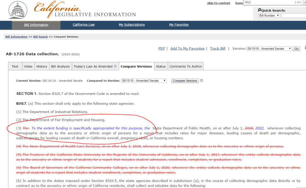 是刘云平和赵美心老公伍国庆在 2011年就搞成了的 8310.7,现在没法反了,只能 repeal. 种族细分,包括把 Taiwanese 分出来,正是这两位在 2011 已经搞成,其实不关 Bonta 的事。Bonta 主要是想加上教育,前面用 public health 掩护一下。现在教育去掉了。掩体实际上也基本无法实现。