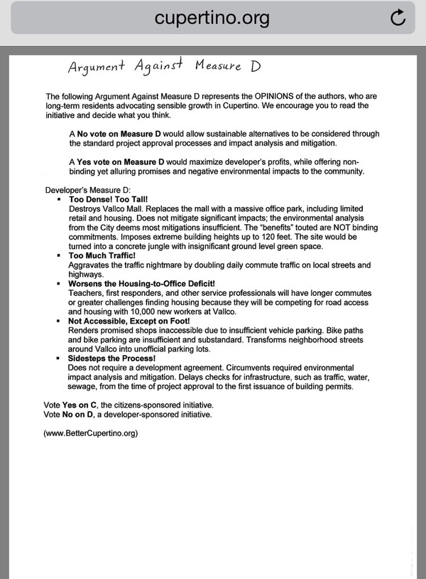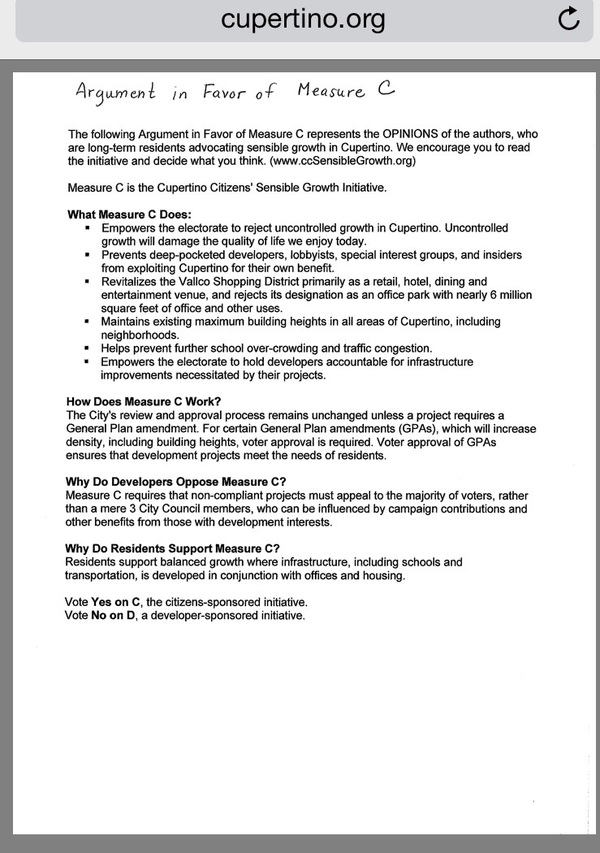被告市民的言论就公布在Cupertino城市官方网站的选举信息部分,内容有支持Measure C(Citizen提案)的言论,也有反对开发商提案Measure D(Developer提案),已贴在文后。所有的人都可以看看,这些话到底是不是在散布虚假信息?本周一,8月29日,在第一次开庭取证时,开发商方面就提出,要求城市立刻删除这些虚假不实的言论。除非官司打完,确定几位市民无罪,才能把这些言论给贴回来。这不是赤裸裸地封杀言论自由是什么?!