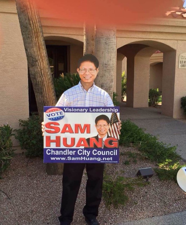 8月30日,亚利桑那州Chandler-钱德勒市举行市议员竞选。至次日凌晨电脑开票统计的结果,唯一的华裔Sam Huang-黄馨民,在八名竞选者中排名第二,得票超过一万,占总数的17,49%,终于成功当选钱德勒市议员。
