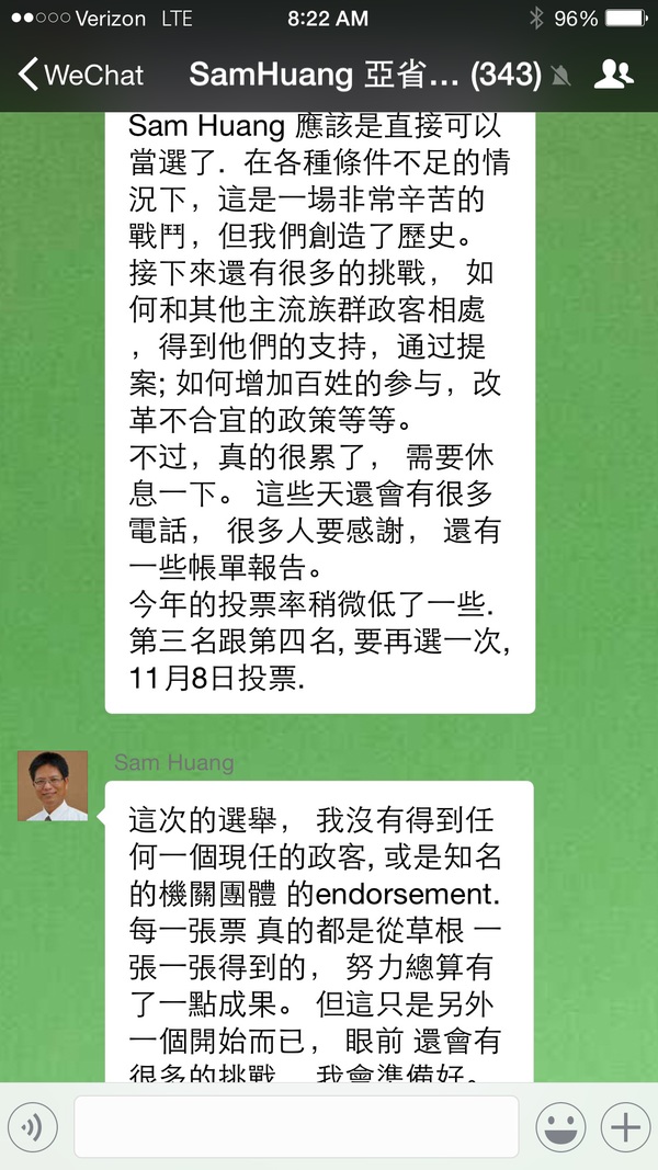 Sam Huang表示:這次的選舉, 我沒有得到任何一個現任的政客, 或是知名的機關團體 的endorsement。每一張票真的都是從草根 一張一張得到的, 努力總算有了一點成果。 但這只是另外一個開始而已。 眼前,還會有很多的挑戰, 我會準備好。