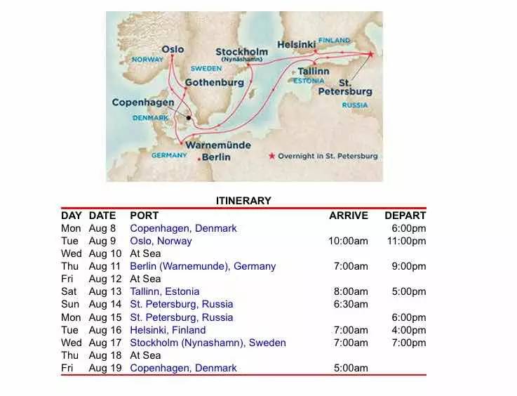 今年八月,我和家人乘坐Princess Regal号邮轮去了趟北欧,为期十一天。上图是我们的大致行程。之前常听朋友说,公主号邮轮上的食物不错,还有英式的下午茶,总想试试,这回总算得偿所愿。但结果有点令人失望。