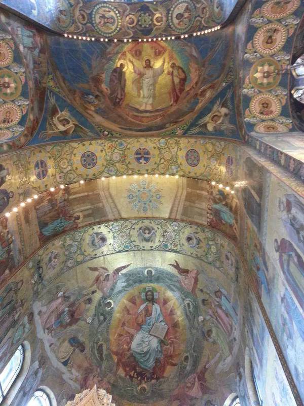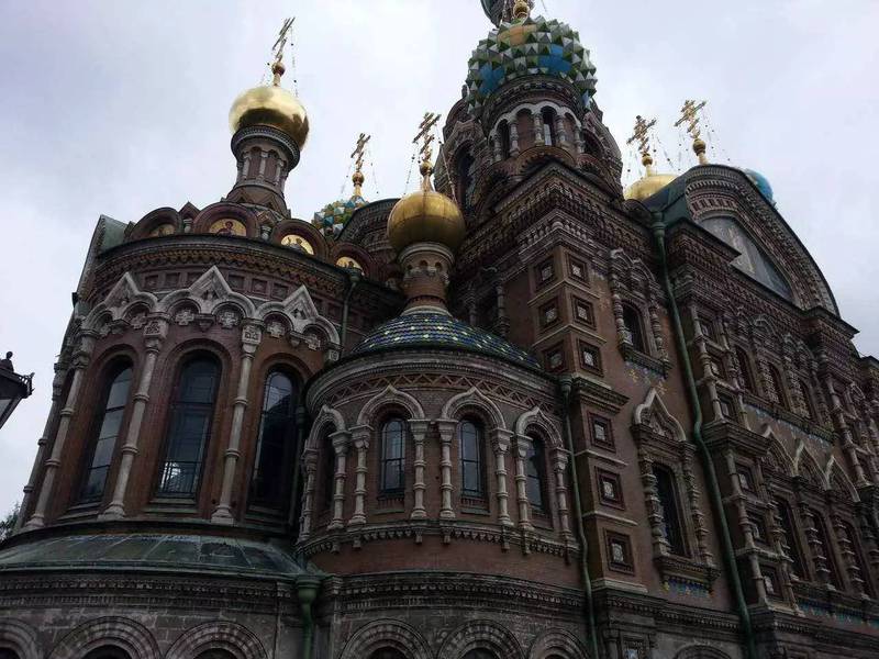 午饭后,我们去参观了Spilled Blood Church, 中文名叫复活教堂。它是因沙皇亚历山大在此被革命分子暗杀而得名,故又名滴血教堂。教堂内用了7000 平方米的马赛克来装饰,图案非常精细逼真,以蓝色为主色调。