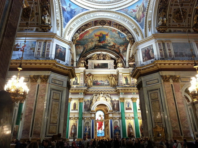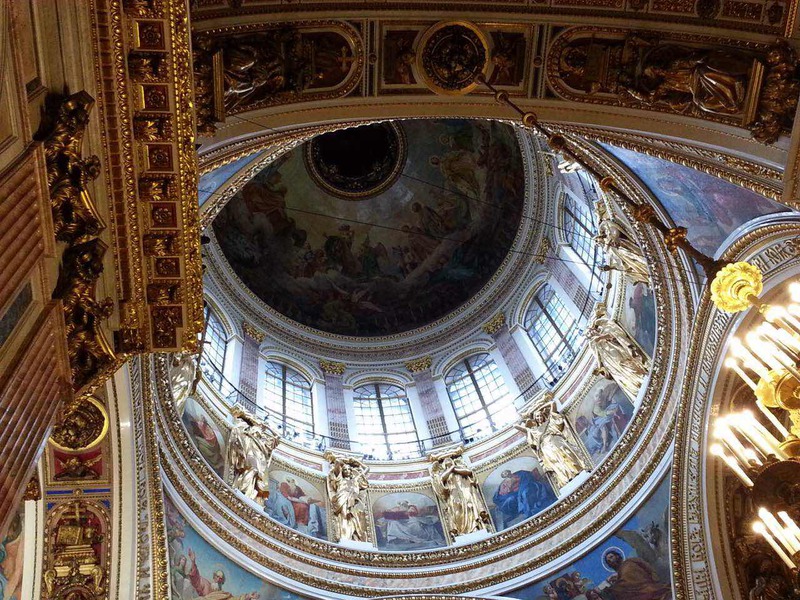 接下来,我们又参观了St.Issac's Cathedral。此教堂花了四十年的时间完成,是目前世界上有名的大型圆顶建筑之一,可与罗马的圣彼得大教堂媲美。内部用了四十三种矿石和大理石装饰,相当耀眼夺目。