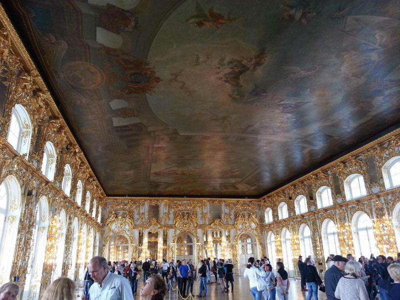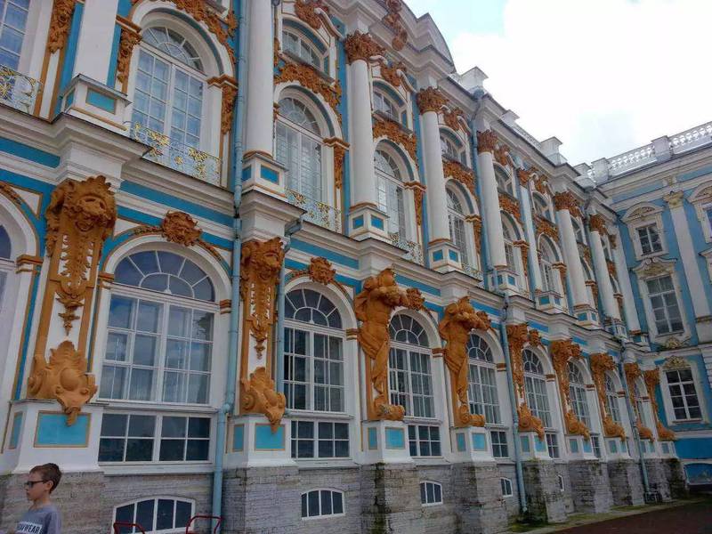 紧接着,我们走过去Catherine Palace. 这宫殿是彼得一世送给夫人Catherine的礼物,设计是巴洛克式风格。宫殿内有个Amber Room, 即是琥珀宫,整个房间是用了大量的琥珀来装饰的。可惜不准拍照。
