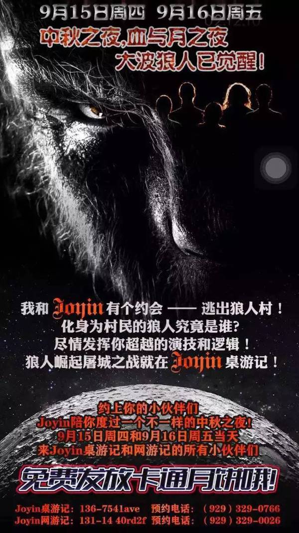 🌃9月15日周四和9月16周五,中秋🎑之夜,血与月之夜,大波狼人已觉醒!我和joyin有个约会——逃出狼人村!化身为村民的狼人究竟是谁?尽情发挥你超越的演技和逻辑!狼人崛起屠城之战就在Joyin桌游记!约上你的小伙伴们,Joyin陪你度过一个不一样的中秋之夜!