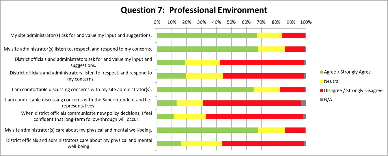 除了上图提到的学监和学区委员对教师缺乏尊重和沟通,下面两张图对这种反差提供了更多解释。