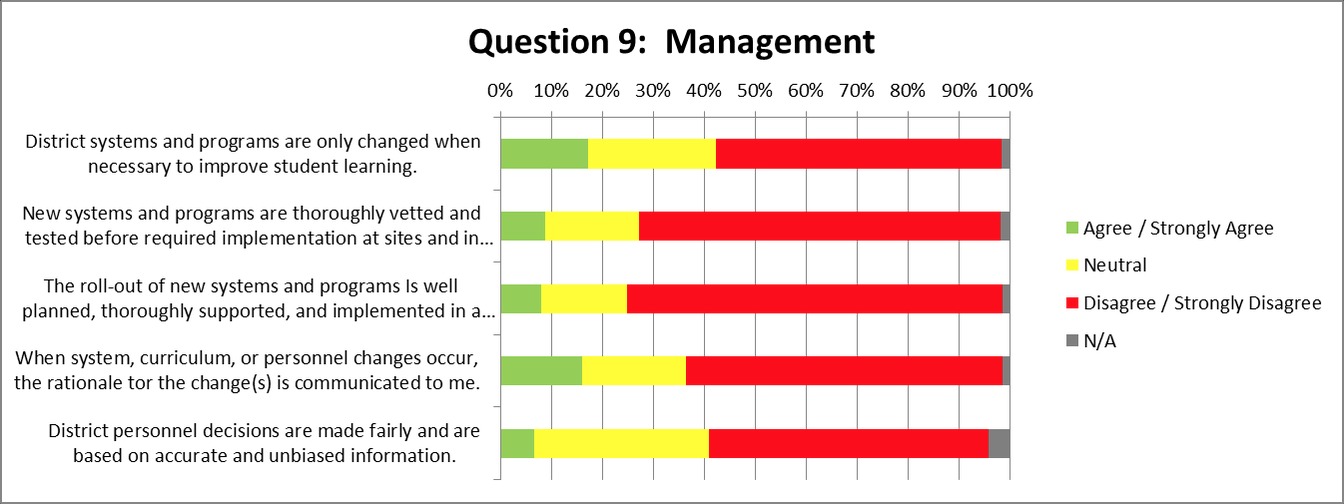 今年初,学区教师工会CEA(Cupertino Education Association)做了一次调查,79%的教师填写了问卷。教师对学监和学区委员的评价之低让人瞠目结舌。