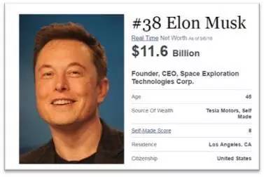 马斯克这位生在南非,留学美国,白手起家的亿万富翁在今年福布斯全球最有影响力人物榜排第38名。