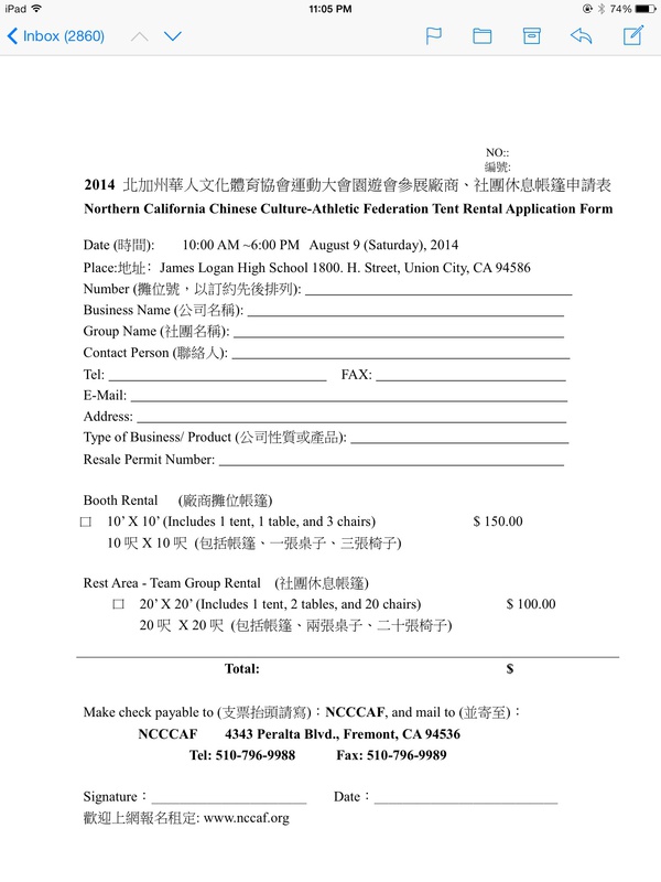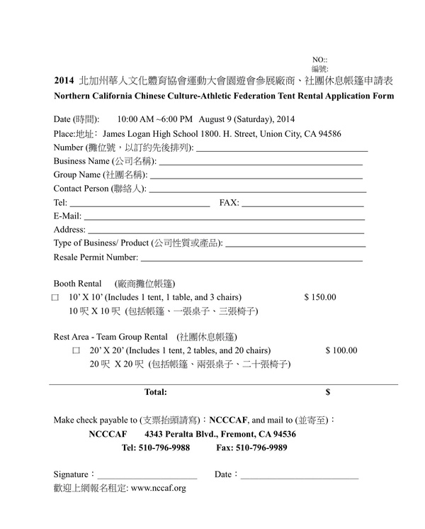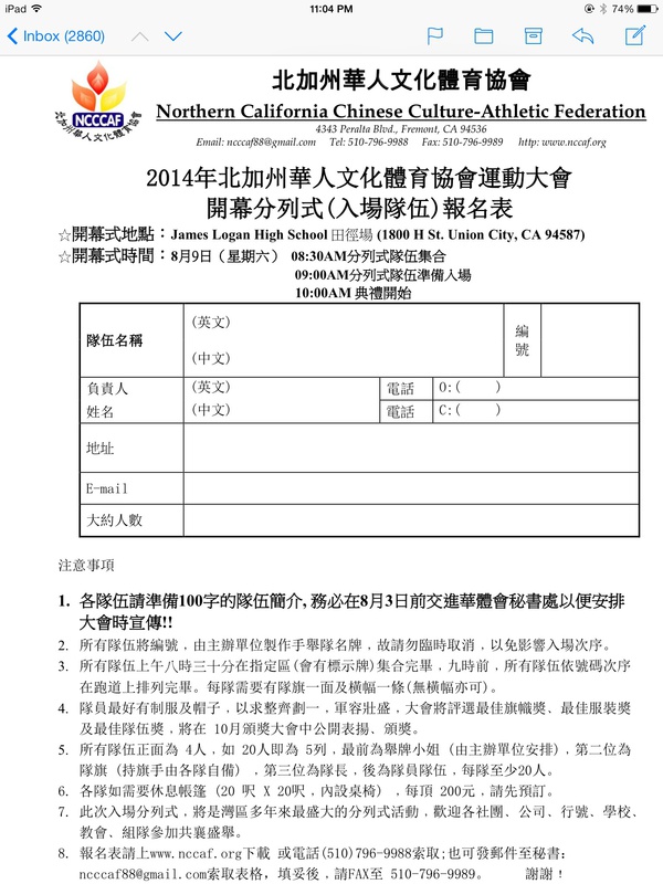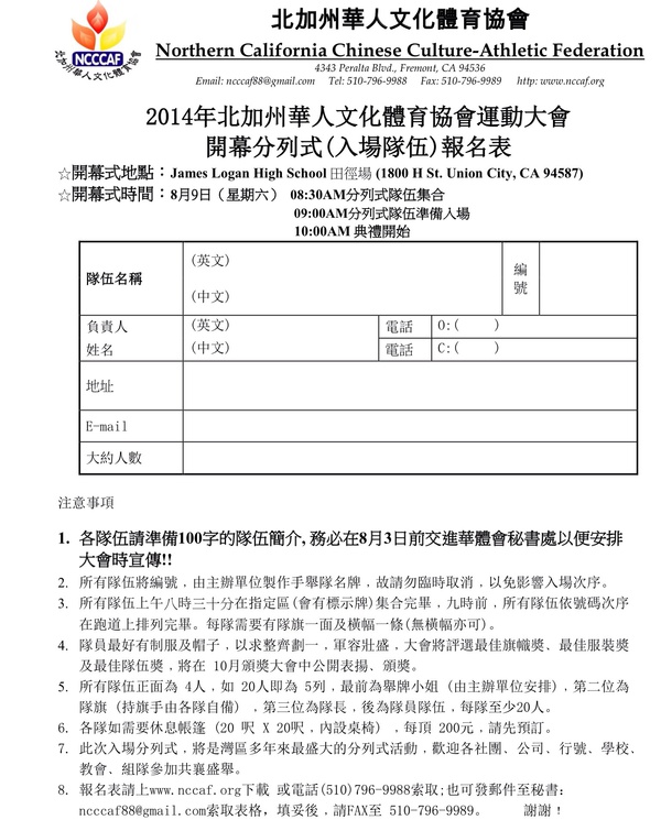 素仰 貴社團在積極參與各種社會公益事業的活動中,在增進海內外華人的友誼和為華夏民族的團結復興的各種活動中享有盛名。在此,我謹代表北加州華人文化體育協會,誠摯的邀請您及貴社團前來參加這一盛會,並為這一海外華人最大規模的體育競賽活動添光加彩,如蒙應允,不勝榮幸,請填妥開幕入場式報名表及一百字社團簡介或遊園會報名表寄至我處,我們8月9日早上九時在聯合市James Logan High School田徑場 (1800 H St., Union City ,CA 94587)見。