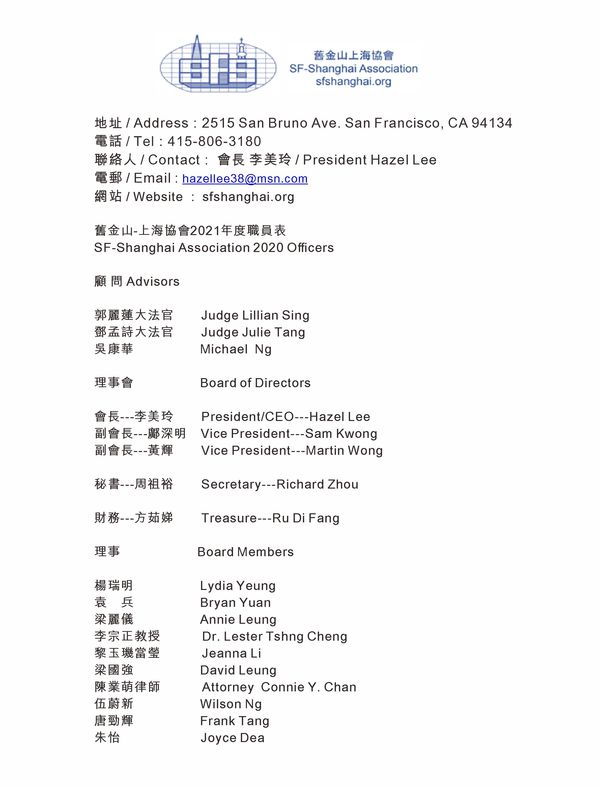 SF-Shanghai Association 2021 officers 🌟About US 4.0/1 http://www.weidb.co/p575541 获取作者更多文章 上一页 下一页 1. SF-Shanghai Association 2022 Officers(53143) 2. Donation and Volunteer(72348) 3. About Us(75318) 4. SF-Shanghai Association 2021 officers(76432) 5. SF-Shanghai Association 2019 Officers(83376) 6. SF-Shanghai Association 2018 Officers(96707) 7. On 2/19/2016 event(88001) 8. About US(94312) 9. World Journal News(92751) 10. membership(229033) 11. Certificate(98137) 上一页 下一页