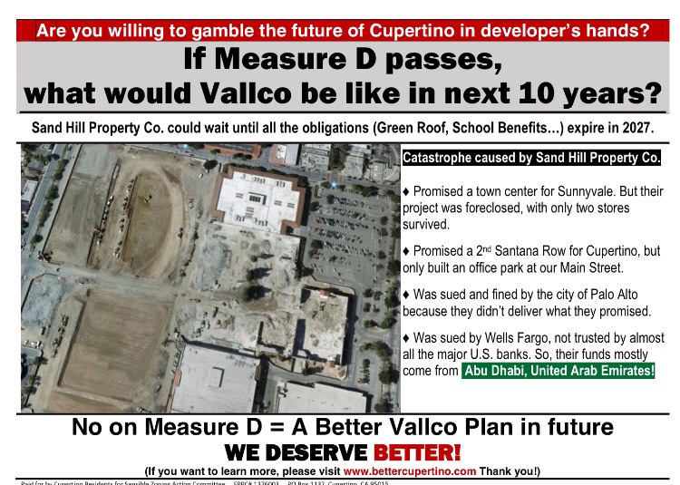 在这里,他搞错了一个基本事实。No on Measure D,并不等于Vallco不开发,而是期待开发商拿出一个与市民更有共识性的方案。现在Vallco开发计划,60%-70%都是办公楼,只剩下16%的零售商店,这种计划就相当于扒掉现在的商场去倒卖楼盘。获利最大的只有开发商,对于城市的负面冲击难以估量。而只有Vote No on D,我们才真正有改进Vallco的机会。