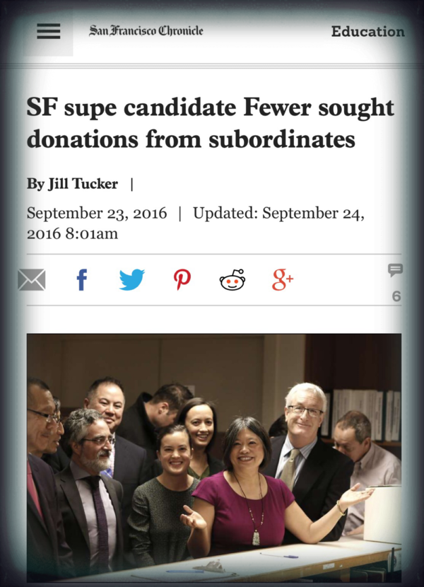 除此之外,李麗嫦也涉嫌腐敗。「三藩市紀事報」2016年9月23日報導,李麗嫦,現任校區委員,涉嫌違規籌款、公器私用。 http://www.sfchronicle.com/education/article/SF-supe-candidate-Fewer-sought-donations-from-9243062.php