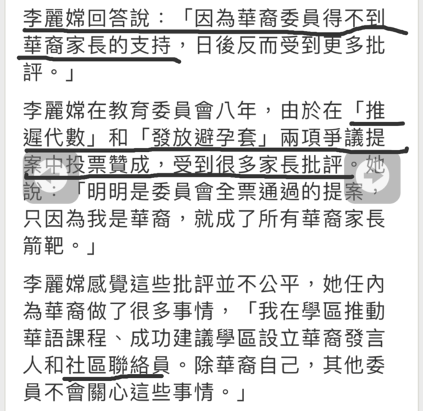 世界日報的報導還說,李麗嫦認為家長們針對她是華人的校區委員而諸多刁難。但在初中學生「可以領取避孕套卻不可以讀代數」的問題上,是她首當其衝地斥責華人家長,說家長們講大話、散步遙言,和把問題政治化。