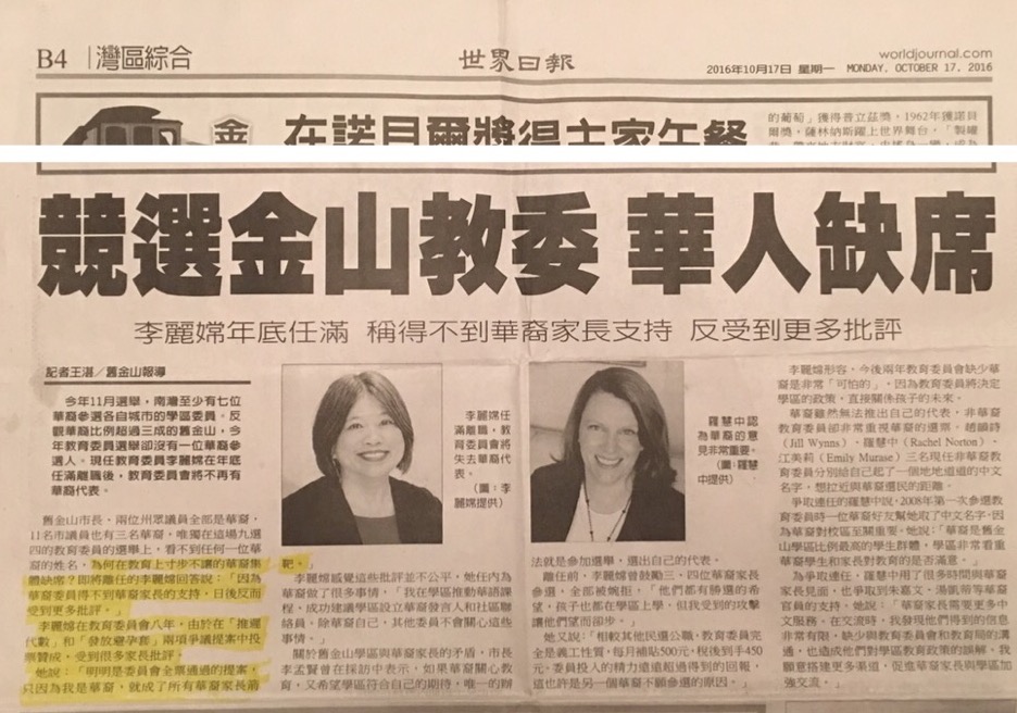估计李麗嫦也知道,自己的日子不好過。在2016年10月17日的世界日報報導中,李麗嫦自認得不到華裔家長的支持。她反對市長、以權謀私、害人子女,怎麼會得到華裔家長的支持?!