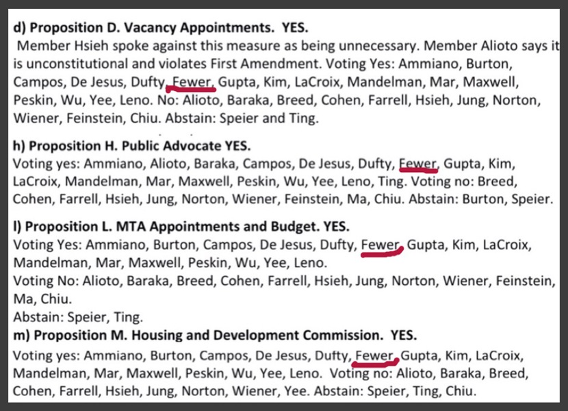 在還未放上網的8月17日的DCCC民主黨的背書投票會議紀錄中看出,李麗嫦的投票取向與金貞妍一樣,均對李孟賢市長不利的四條提案D、H、L、M投下贊成票,對奪走市長行政權、制衡其能力,落下鐵了心的重鎚。