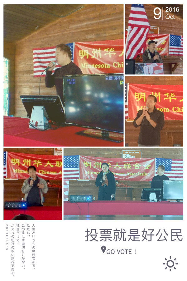 白中奇(Jack)引用当前流行的话说,政治其实很简单,就两件事:一是Show up!(站出来)二是Show up again!(继续站出来)。他最后专门强调,今年美国大选投票日是11月8日,根据法律投票前必须先进行投票注册。明州投票注册截止日是10月18日,希望年满18岁但还没有注册的华人选民,抓紧时间,积极投票,踊跃参与公共事务,发出在美华人自己的声音。