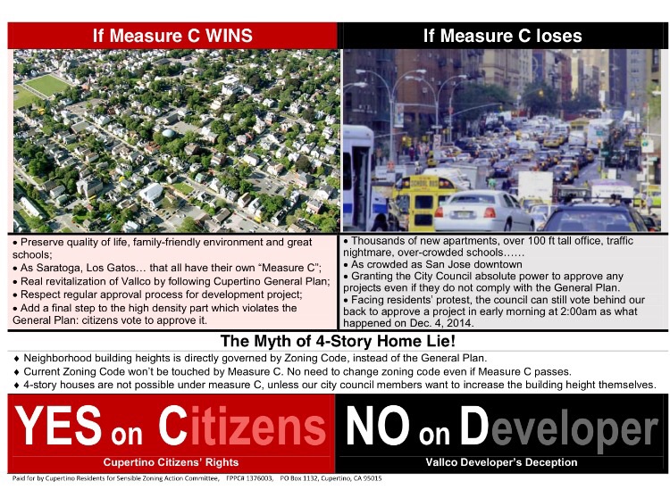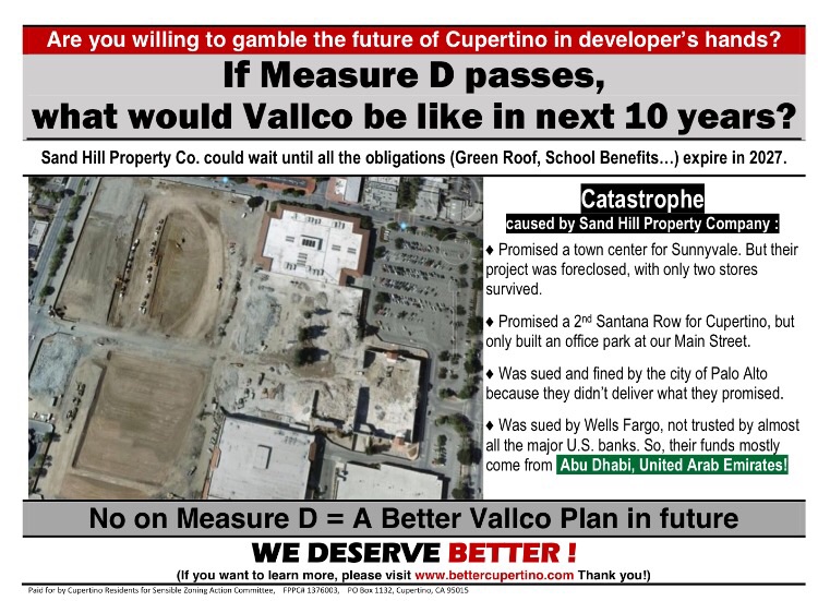 到现在为止,Vallco开发商已经投入了大约5 million资金,抹黑打压市民公投Measure C (Citizens' Measure), 用谎言广告包装Measure D(Developer's Measure)。Cupertino市只有大约两万五千选民,开发商的花费大概是一个人头$200来买我们的选票。这本身就证明了反抗Vallco项目的民意呼声是多么强烈!如果这个项目真的像广告里面吹嘘的,犹如人间仙境,为什么市民的反对会如此坚决?
