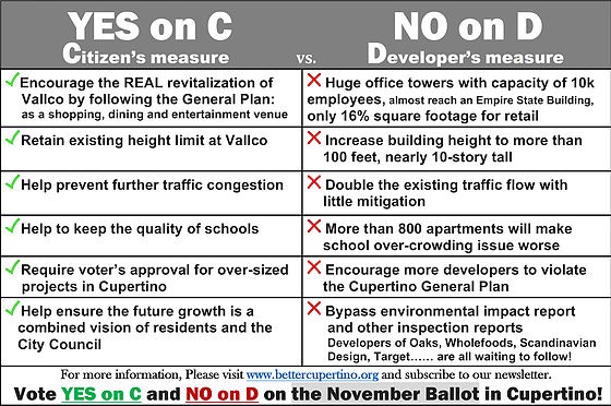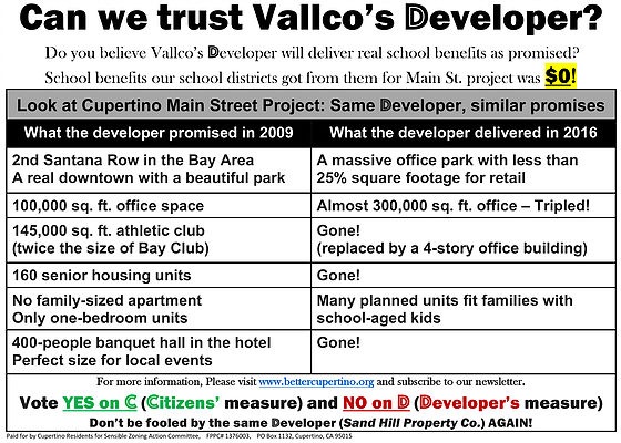 请用网络告诉更多人,Cupertino的市民没有被蒙骗,更无法被收买!我们支持城市理性发展,反对牺牲零售业改成Vallco疯狂的百尺高办公楼,800公寓......