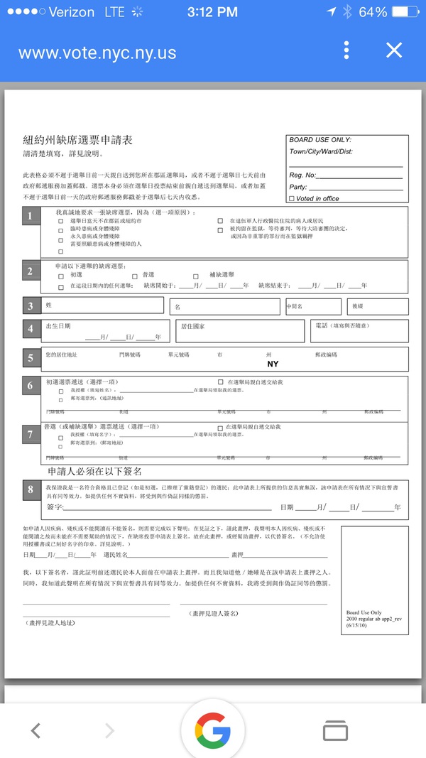 紐約市選舉局(Board of Elections in the City of New York)答:像你這種情況可以申請「缺席投票」。如下情況之人可以申請「缺席投票」:一是因為外出不在紐約市而不能在選舉日當天抵達投票處的登記選民;二是如果由於一項輕罪而正在候審或在押之中,但若已被判重罪,則失去投票資格;三是因患病、殘疾、住院或長期住在醫護中心者。
