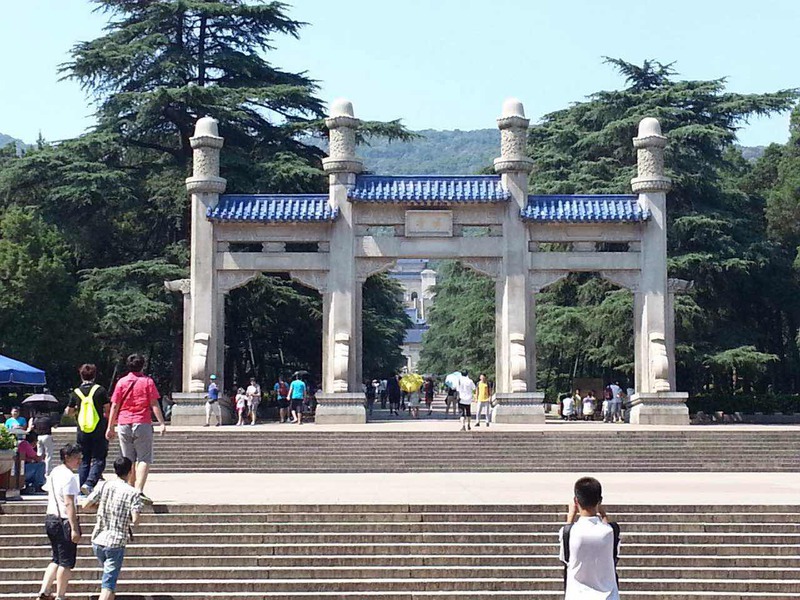南京,中山陵。 顾名思义,这里是孙中山先生的陵墓,她的周边是一个绿化得很好的公园, 道路两旁的梧桐树高大整齐。但上陵墓的阶梯上,完全没有树荫遮挡,火辣辣的太阳晒得你无处躲藏,让我们着实领略到火炉的滋味。我赶紧跑去买了两把伞,价钱RMB120,比东京还贵呢。