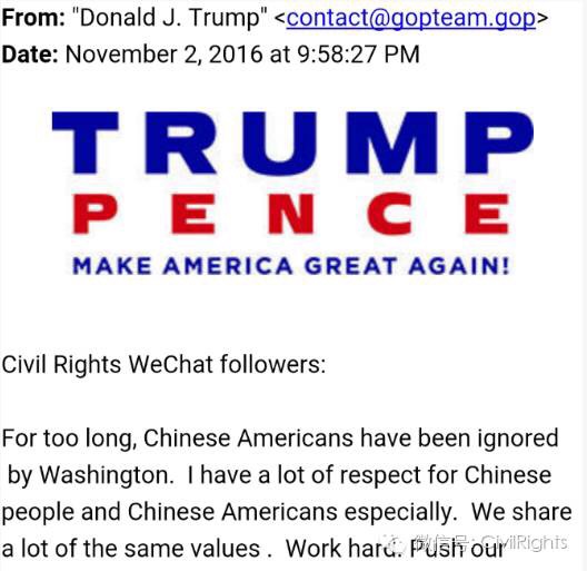 通过他的团队,共和党总统候选人川普先生给咱Civil Rights微信公众平台的读者朋友们写信了!该信的开头就感慨了华盛顿政客对华人的长久忽视,并阐述了诸多和我们中国人民以及在美华人相同的价值观。
