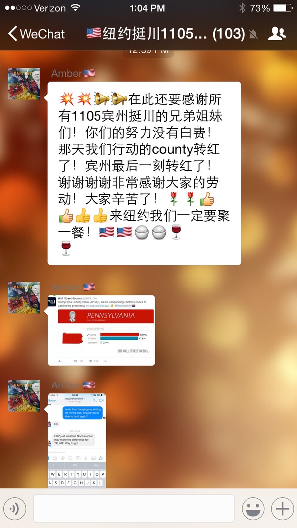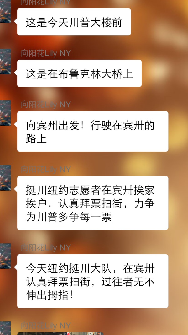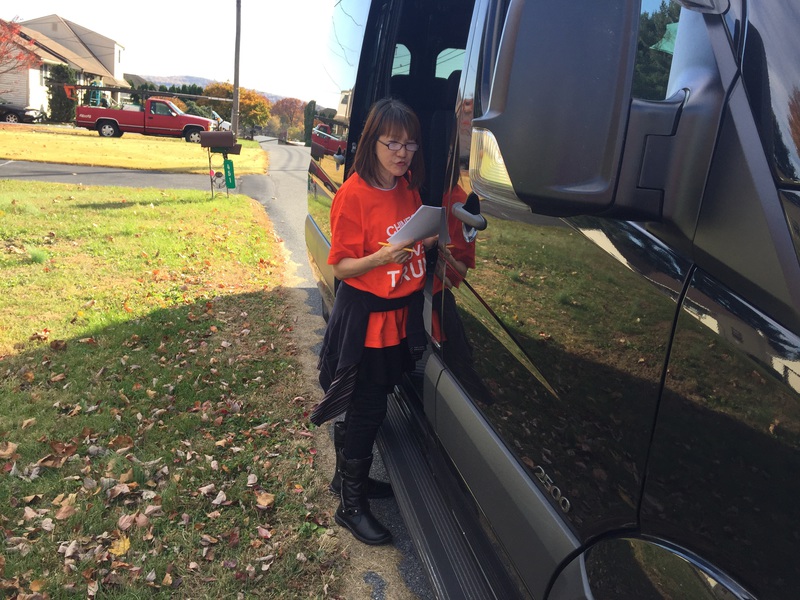 11月9日:志愿者/Julie 1404: 我们上周6宾州挺川团赢了。还在为当时看到每一辆过往汽车为我们鸣笛,我们看到同志的兴奋,我们挨家挨户的去敲门,有拒绝我们的,有说不敢兴趣的,有说我投川普的。每听到这一句,我们就兴奋,怀着这心情,我们各街扫票,我们一起书写了历史!