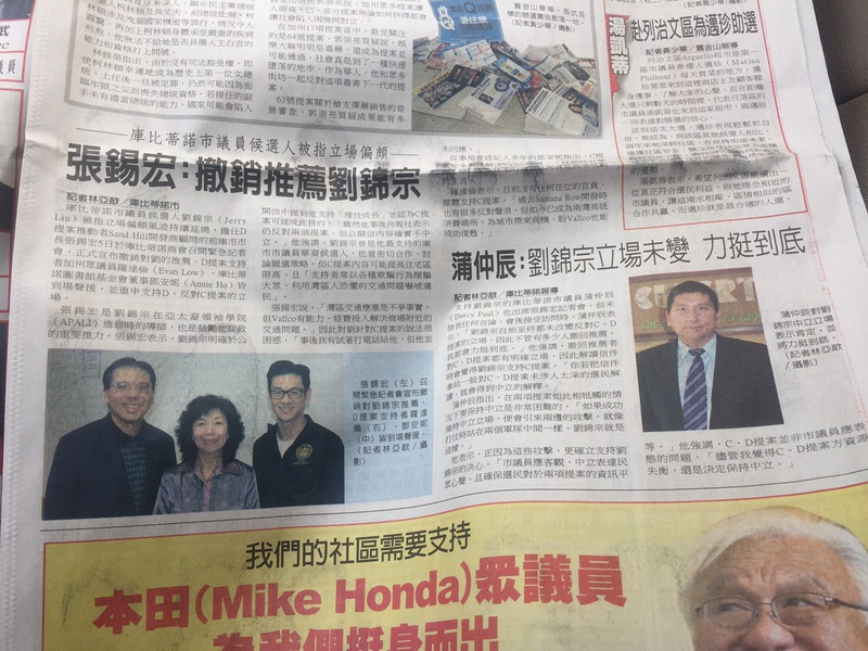 2016年,处于北加州硅谷心脏地带的小城Cupertino,在开发商与当地居民之间展开了一场惊心动魄的选战。这里选民只有大约二万五,而开发商选战投入已超过$10 million。天文数字的助选经费引发各种社会漩涡。就在本周末11/05,世界日报北加版刊登两篇针锋相对的新闻,针对Cupertino的C,D提案选战,聚焦点则在一位华人候选人刘锦宗Jerry Liu身上。照片见附图,两则擂台文排列在一起,眼球冲击力非常强烈。左边的新闻里,张锡宏Michael Chang,罗达伦Evan Low, Annie Ho代表华人政治大佬宣布撤销支持刘锦宗Jerry Liu,右边年轻的库市华人市议员蒲仲辰Darcy Paul表示立挺Jerry Liu。矛盾焦点在于Jerry Liu对C,D提案的看法。