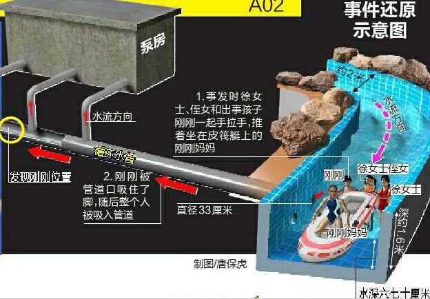 徐女士说,她和刚刚妈妈是很好的朋友,住得也很近,当天上午9点多,刚刚妈妈开车带着他们来到这里。事发时大约是下午3点半,当时刚刚的妈妈坐在一个皮筏艇上,她、侄女和刚刚一起手拉手,推着皮筏艇,从水池里由东向西走,刚刚在最右边,靠近水池壁。