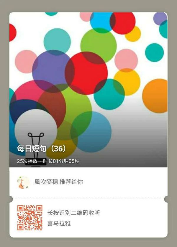 每日美言(36)英中对照簡單蒙福的恩來-102670 06/08 5213 4.0/1 音频連結:http://xima.tv/yT1uVK Not all missed opportunities become regrets; only those you are having a hard time letting go of.不是所有錯過的都會變成遺憾,只有那些放不下的才是。 http://www.weidb.co/p662455 获取作者更多文章 上一页 下一页 1. 每日美言(42)(5610) 2. 每日美言(36)英中对照(5213) 3. 每日短句(30)英中对照(5246) 4. 《道德经》Tao Te Ching (中英对照) 1-20 (4600) 5. 英语金句单词文章列表(12142) 6. 小狐电台 - 英语课程录音, 文化直播节目(11532) 7. "关注自己" vs. "关怀他人"(4875) 8. American Jury 美国陪审团(5597) 9. 《道德经》Tao Te Ching (1 - 11) (中英对照)(5470) 10. 一字诗(21388) 11. Staying active to fight Alzheimer's 适度运动对抗阿兹海默症(15762) 12. 不说三话 不帮三忙 不想三事(22243) 13. 孝顺父母的20种方式(14214) 14. 青春/ 关注自己 / 神能入党吗?(7691) 15. 笑话两则: 老公药片 / 偷酒(30044) 16. 爱的五种语言(7989) 17. 永远幸福的科学(7023) 18. 网恋 爱情执念 缘分 (5808) 19. 男人来自火星,女人来自金星(6106) 20. 风花雪月座谈会: 职业~事业~风景~焦虑~平常心(11547) 21. 圣言拾穗 箴言Proverbs 19:1-3(5740) 22. 出轨(5745) 23. 金句美詞(6166) 24. 今日英语分享 7/4/2018(8810) 25. 智慧 Wisdom:敬畏耶和华是智慧的开端(9819) 26. 四大名书遇着标题党(5655) 27. Smart People vs. Wise People(7341) 28. 痛苦中的平安 Persevering with Peace(5865) 29. 青春(6929) 30. 我愿成为光体(6763) 31. 續集(6995) 32. Emotional Intelligence(4495) 33. Loving Life 热爱生命(4941) 34. Streams in the Desert 荒漠甘泉 Feb 20(6547) 35. 愛所有人 Loving All (Daily Bread)(6644) 36. 2/11/2018 灵糧(8654) 37. The Power of Prayer 禱告的大能 (14726) 38. 曠野中的安慰(每日靈糧)2018年2月8日(9391) 39. 英語版: 面朝大海,春暖花開(4753) 40. 曠野中的安慰 (每日靈糧)2018年2月7日(16322) 41. 十个快乐的好习慣(2916) 42. 誰是我們身边的貴人(2024) 43. 將憂鬱轉為滿足与平安(3489) 44. Ronald Reagan Presidential Library(6839) 45. 中英双语朗读 English Reading Dec 22, 2016(4289) 46. New Children's Museum(6549) 47. 请吃饭(3554) 48. 基督徒的10条职场箴言(4399) 49. 正确认识苦难(2224) 50. 7 things emotionally intelligent people avoid(20857) 上一页 下一页