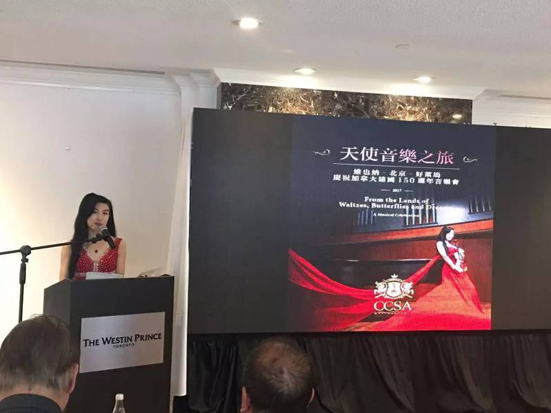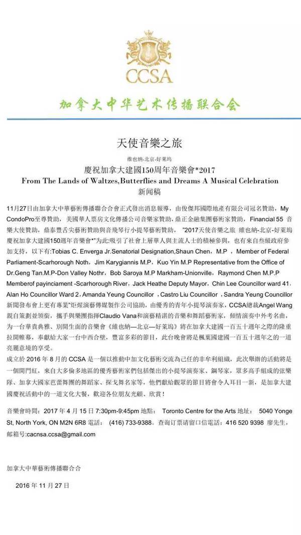 2016年11月26日下午,多伦多"天使音乐之旅"维也纳-北京-好莱坞 庆祝加拿大建国150周年音乐会*2017 的新闻发布会 在多伦多威斯汀王子饭店( The Westin Prince Toronto Hotel ) 隆重举行。此次音乐会由多伦多皇家音乐学院,青年小提琴演奏家Angel Wang领衔及携手和多伦多知名音乐家们和芭蕾舞表演艺术家们,以多元文化为背景,共同为即将到来的2017加拿大建国150周年,精心打造一场具有中西方色彩的从“维也納到北京”具有高雅意境的古典音乐会。