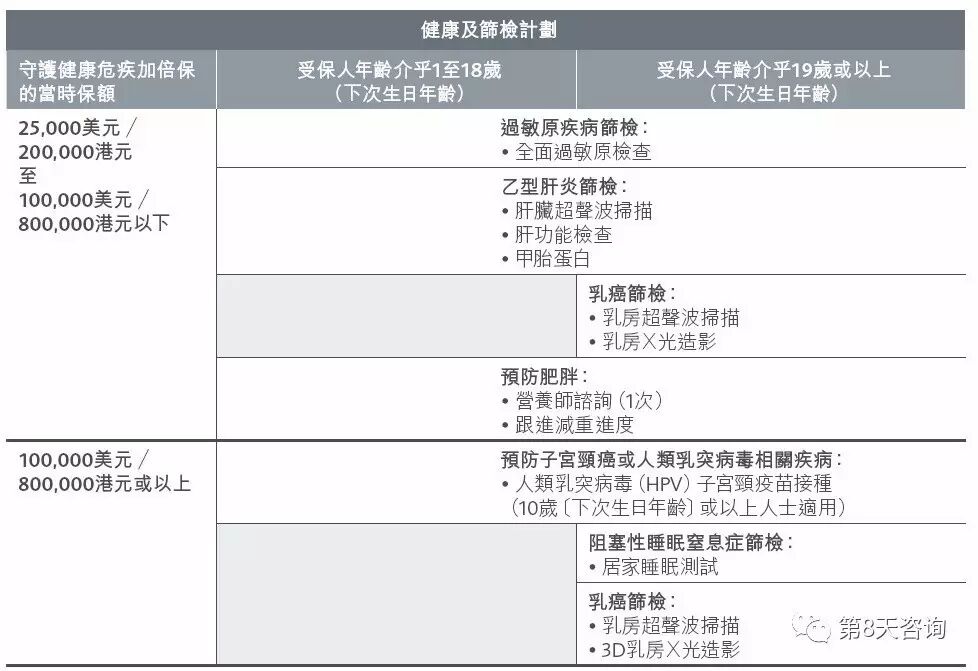 如果投保额超过25000美金,在第二个保单周年日,受保人就可以享受以下的其中一项健康检查或者接种一项疫苗。其中,保额超过10万美金,就可以免费接种HPV疫苗!(这个疫苗现在在香港的价格在4000 HKD左右。)
