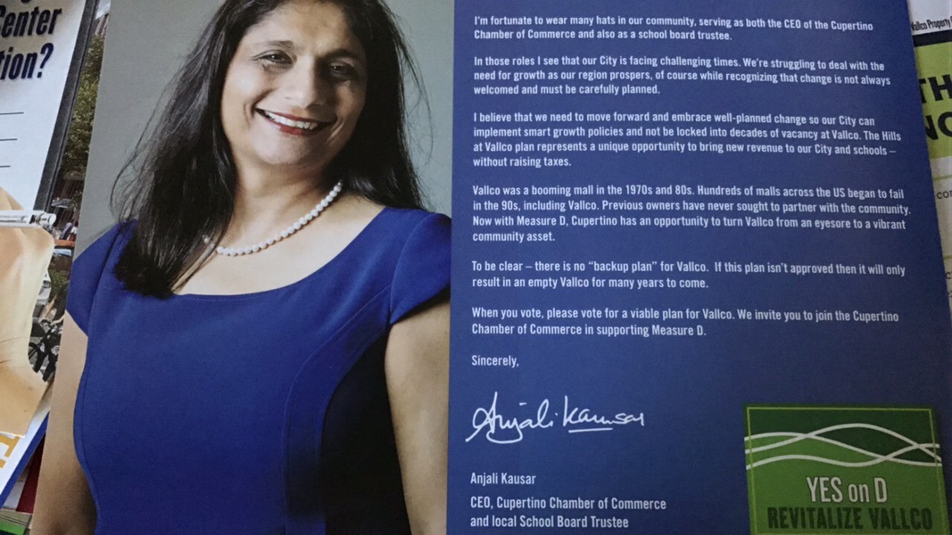 于是,问题就来了。商会board的职责是,要确定Anjali确实为商会服务兢兢业业,她才对得起这份高薪工作。她的行为必须把本地商会利益放在第一位,否则她就对不起自己的高薪。商会的board就有权力选择其他更合适的人选来取代她。也就是说,既然是拿钱干活的工作,只要你不好好表现,就有随时被fire的风险。这也解释了为什么库市市议员,其他CUSD现任官员,全部不敢给Vallco的开发商Measure D广告公开代言,而Anjali却一再担当出头鸟,不光照片上了大幅广告,而且上的广告mailer不止一次。因为Vallco开发商SHP在库市商会势力太大,她的职位注定她必须为SHP多赚钱而服务。