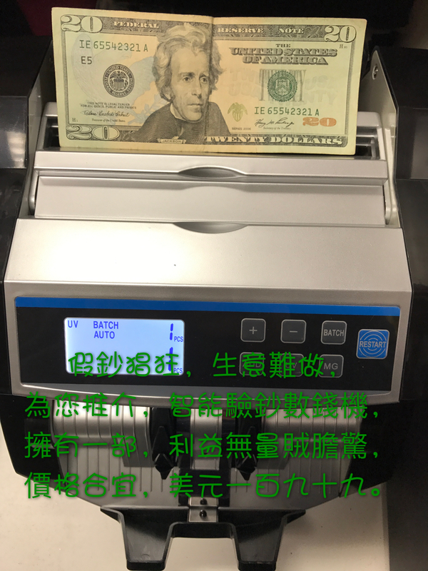 現在市場流行太多假幣了!🈶️收現金的餐館及商號,最好要擁有一部驗鈔機預防萬一哦!這是一部驗鈔與數鈔二合一的智能機,才$199.99美元哦!放在顯眼處,會為您們帶來不少的利益哦,記得與我聯繫(646)703-1855 Jacky Cheng