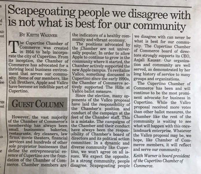 而就在同一天,库市当地小报Cupertino Courier刊登了一篇库市商会主席Keith Warner为Anjali Kausar强力站台的文章,形容Anjali是一群反对商业的暴民用以泄愤的替罪羊。从头到尾,文章里反复强调的就是business, business, business。里面说库市商会为库市business繁荣做出了突出贡献,库市商会的组成并非只有大发展商,也有很多很多小商户。里面谴责在选举中对C/D提案有不同意见的市民敌视不同政见者,敌视business。里面还说,Anjali Kausar对business贡献重大,商会board会全力支持她工作。