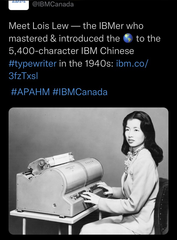 引言:“70 多年前, Lois Lew 在演讲中泰然自若地操作着一台令人难以置信、命运多舛的中文打字机。这位打字员在 IBM 努力使中文这种语言通过键盘上实现流动和传播中发挥了重要作用。