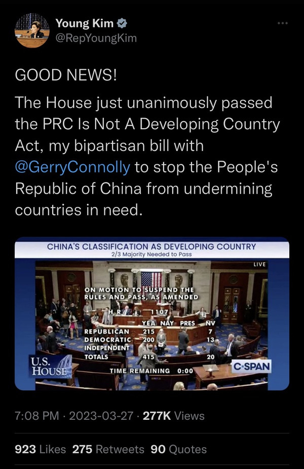 今年3月底,众议院曾以415票赞成,0票反对的结果全数通过类似的法案。由加利福尼州的共和党联邦众议员金映玉(Young Kim)与维吉尼亚州的民主党联邦众议员杰里·康纳利(Gerry Connolly)跨党联袂提出的《中华人民共和国不是发展中国家法》(PRC Is Not A Developing Country Act) 要求美国国务院对国际组织施加影响,把中国重新归类为高收入、中高收入或者发达国家,而不再视其为发展中国家。法案要求国务院劝说这些国际组织不要让中国得到任何给予发展中国家的特殊待遇。