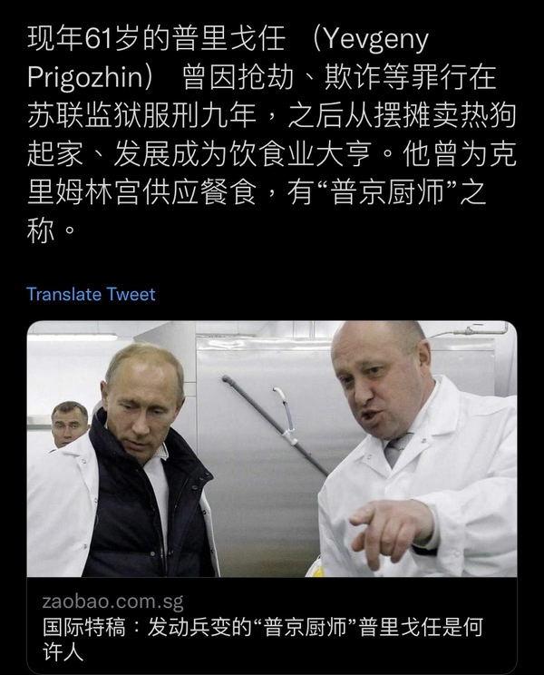 现年61岁的普里戈任 (Yevgeny Prigozhin) 曾因抢劫、欺诈等罪行在苏联监狱服刑九年,之后从摆摊卖热狗起家、发展成为饮食业大亨。他曾为克里姆林宫供应餐食,有“普京厨师”之称。
