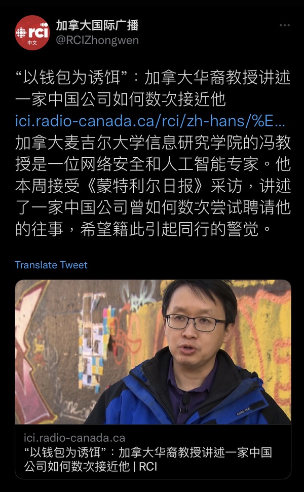 加拿大麦吉尔大学信息研究学院的冯教授(Benjamin Fung)勇敢現身,講述自己被拉攏—的故事:"以钱包为诱饵”:加拿大华裔教授讲述一家中国公司如何数次接近引誘打挖坑他。