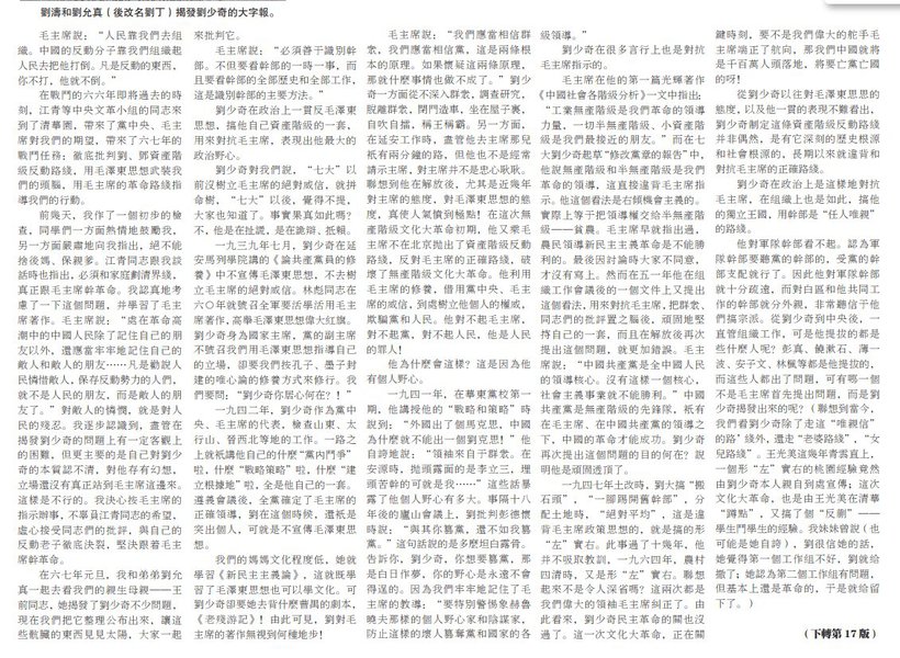 通过我所讲的这些可以看出两条路线的斗争在我们家是多么的激烈。我自己原来根本没有意识到这个问题,但这个问题就是这样尖锐地摆在我的面前。这几个月来我体会到,到底自己是走哪一条路,是站在毛主席这边,还是站在刘少奇这一边,在这上面的确没有什么中间道路可走。我来校前,的确是很保皇的。现在对问题认识也不是十分清楚。简单地谈一谈对我父亲的看法。我认为我父亲确实是党内头号走资本主义道路的当权派。二十几年来一直对抗毛主席,对抗毛泽东思想,他搞的不是社会主义,而是资本主义,走的不是社会主义道路,而是资本主义道路。这次文化大革命运动中,他镇压革命运动,实行资产阶级专政,造成白色恐怖,对毛主席他采取的是一种无视的态度,确实是像林彪同志所讲的,简直是不能容忍。他从不相信群众、害怕群众、害怕群众运动,发展到镇压群众,镇压群众运动的地步。这场文化大革命具有世界意义,它要扫除一切旧的东西,扫除修正主义在我们国家里复辟的可能。他实际上是镇压这场文化大革命的刽子手,沿著他这条道路搞下去,中国必然要变颜色。他的检查极不深刻,一点也没有触及自己的灵魂。他在文化大革命中制定这条错误路线决不是什么偶然的。他以前对我的教育,表面上也让我学习毛选,但实际上是叫我“吃小亏,占大便宜”,“丢了芝麻,拣了西瓜”,“你想得的,反而得不到;不想得的反而得到了”,对他这套人生哲学,以前不太认识,还觉得挺对,但实际上这跟毛主席的完全彻底地为人民服务比起来,完全可以看出是一个更高级的个人主义,带有更大的迷惑性。他的世界观根本就没有改造好,他做了国家主席以后,他大概觉得他占了最大的便宜了吧。他的世界观根本不是无产阶级的,而是资产阶级的。这场文化大革命,就是要革一切资产阶级思想的命,由于他的这种世界观,决定了他一定会制定反动路线。