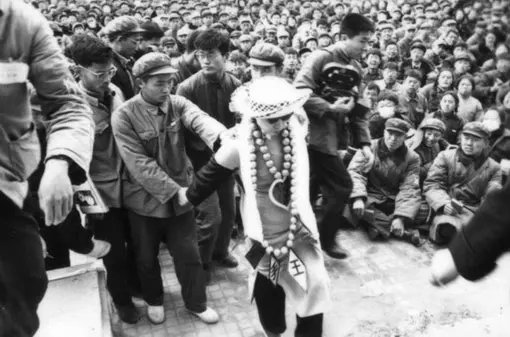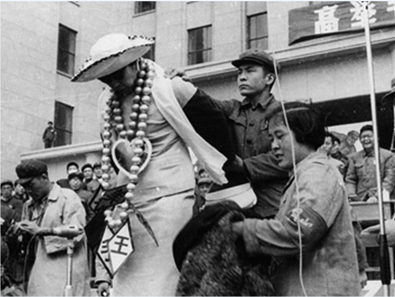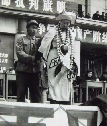 图:1967年4月10日清华大学批斗王光美,王脖子上挂着乒乓球做的“珍珠”项链。
