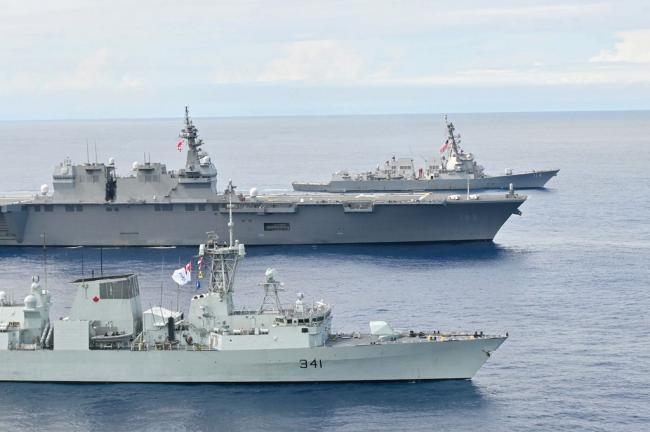 加拿大海军护衞舰渥太华号(前)在参加美日联合演习后,被中共军舰尾随跟踪,还遭到雷射照射。图为美日加在东海联合军事演习。