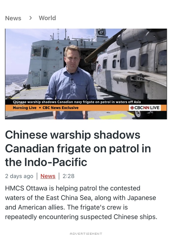 据加拿大媒体报道,本月前来亚太地区与美国、日本举行联合军事演习的加拿大海军护衞舰渥太华号(HMCS Ottawa),在演习结束离开日本横须贺基地后的一周内,至少3次遇上中国海军舰艇接近与跟踪,双方距离一度只有约1公里。加方人员指控,中方以雷射照射他们,并放出无人机跟踪加拿大军舰。