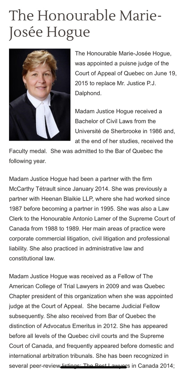 Marie Josée Hogue法官,從業于2015年6月19日被任命为魁北克上诉法院的法官,接替P.J.Dalphond法官。