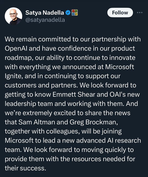 微软首席执行官纳德拉周日晚些时候在X上发布消息称,奥特曼和周五因抗议奥特曼被解雇而辞职的OpenAI总裁兼联合创始人格雷格·布罗克曼,将与未指明的同事一起领导微软的一个高级研究实验室,作为微软内部的一个独立实体运作。