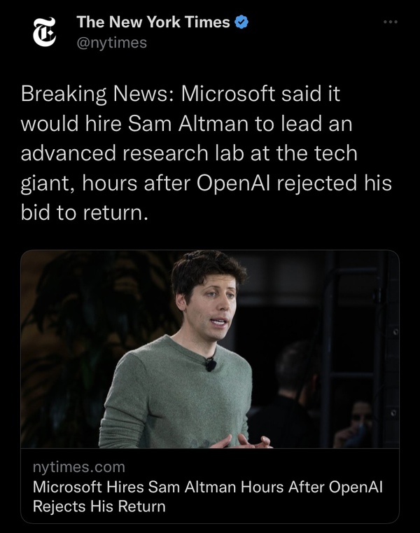 但是在几个小时后,微软又做出了另一个令人头疼的举动,宣布将聘用奥特曼和OpenAI总裁、公司联合创始人格雷格·布罗克曼(Greg Brockman)。布罗克曼辞职是为了声援奥特曼。这两人将领导微软的一个高级研究实验室。